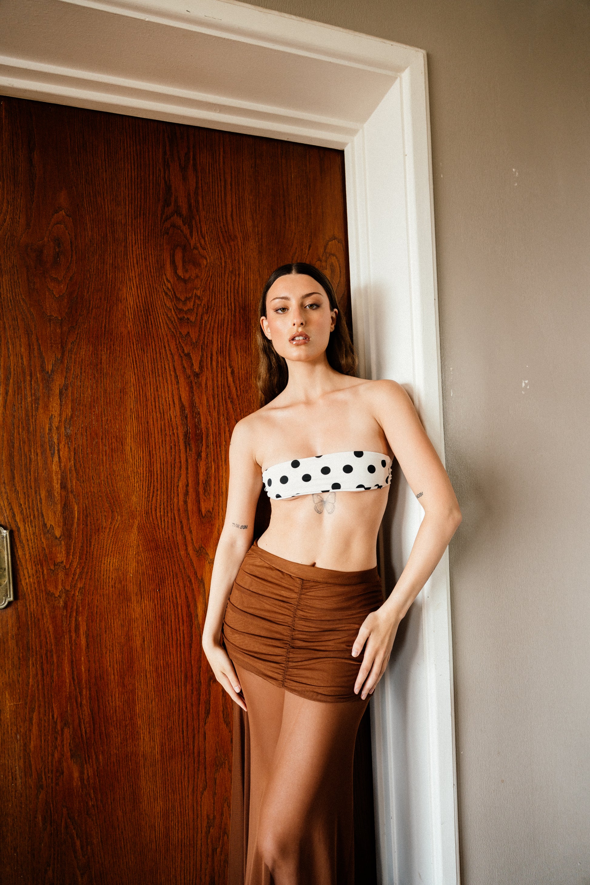 Falda con silueta entallada confeccionada en tela liviana con caída fluida. El diseño presenta una mini base drapeada con fruncido central que se adapta al cuerpo y genera textura en la parte frontal.