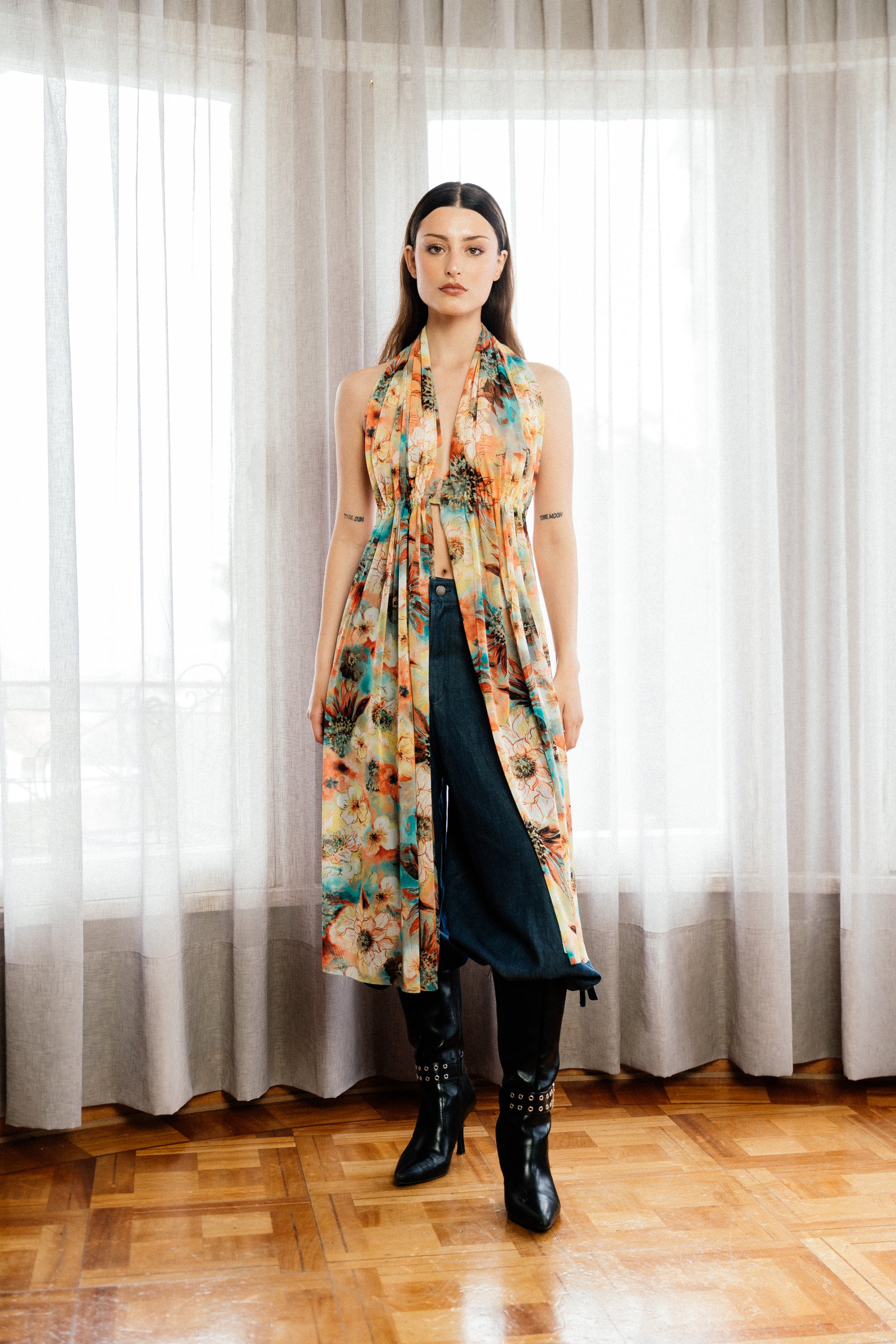 La caída amplia y abierta al centro crea una silueta etérea que puede llevarse como vestido o sobre otras prendas.