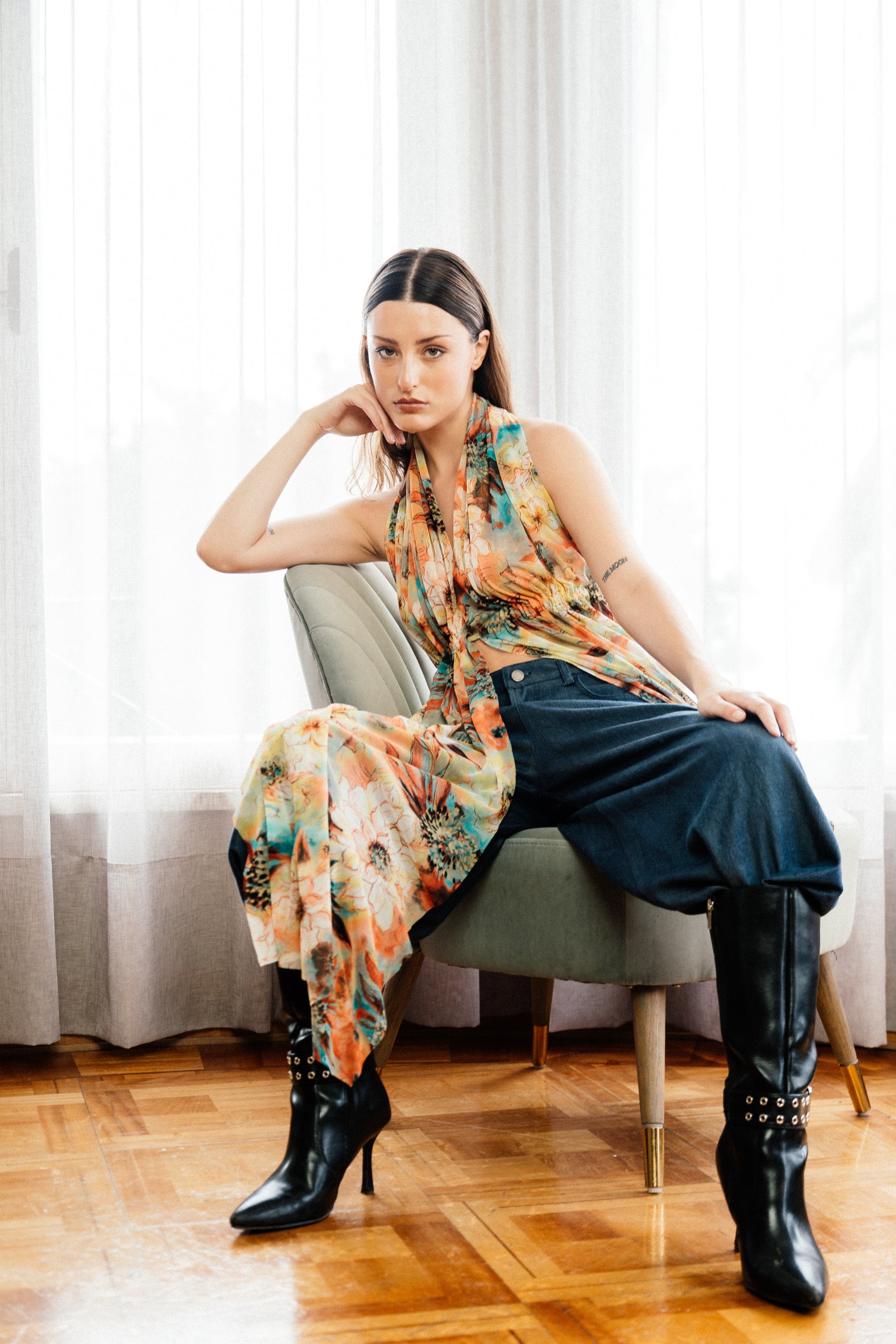 Su construcción fluida genera un efecto de movimiento y ligereza que acompaña naturalmente el cuerpo.