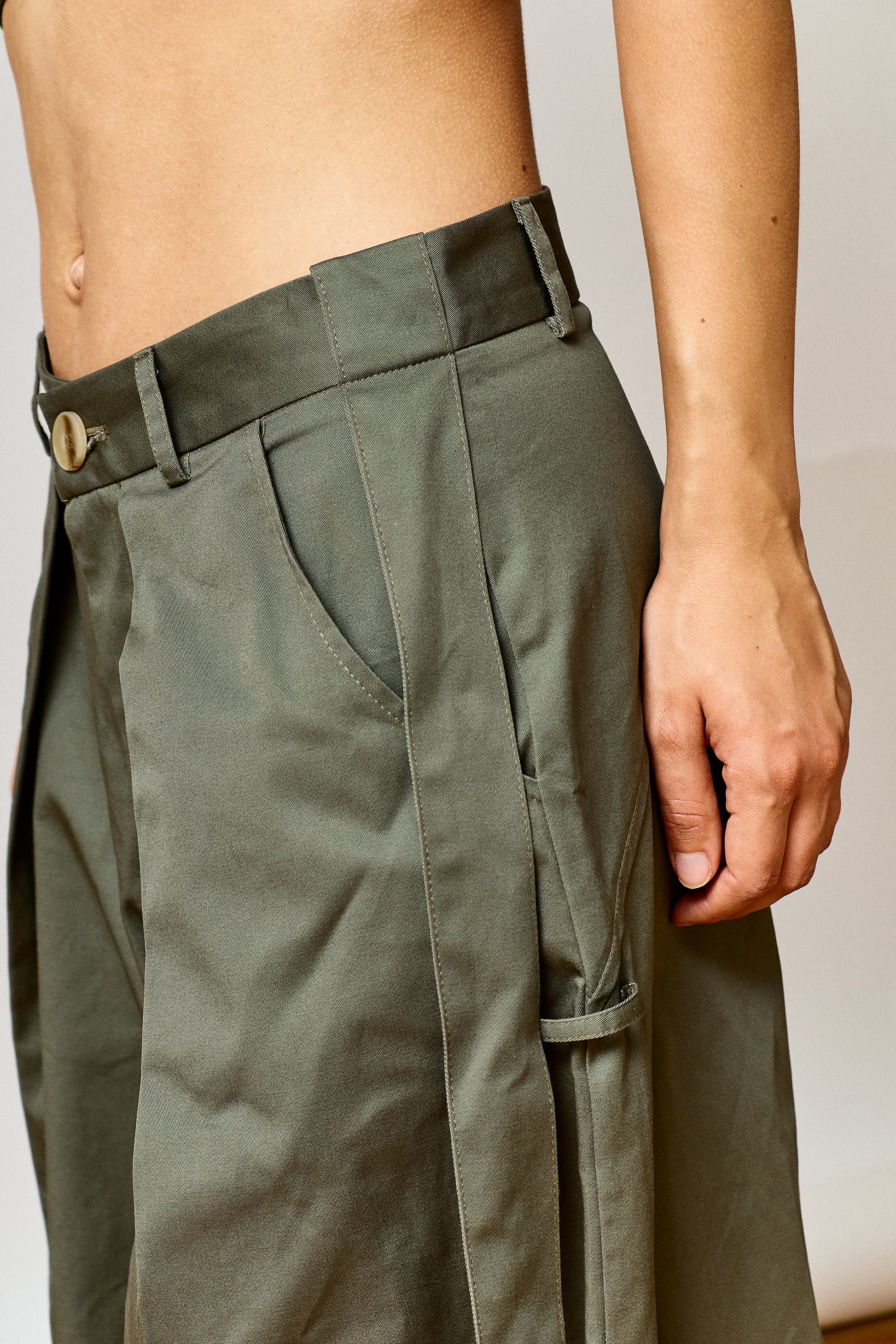 Tiro medio alto, con bolsillos laterales, cierre y botón.