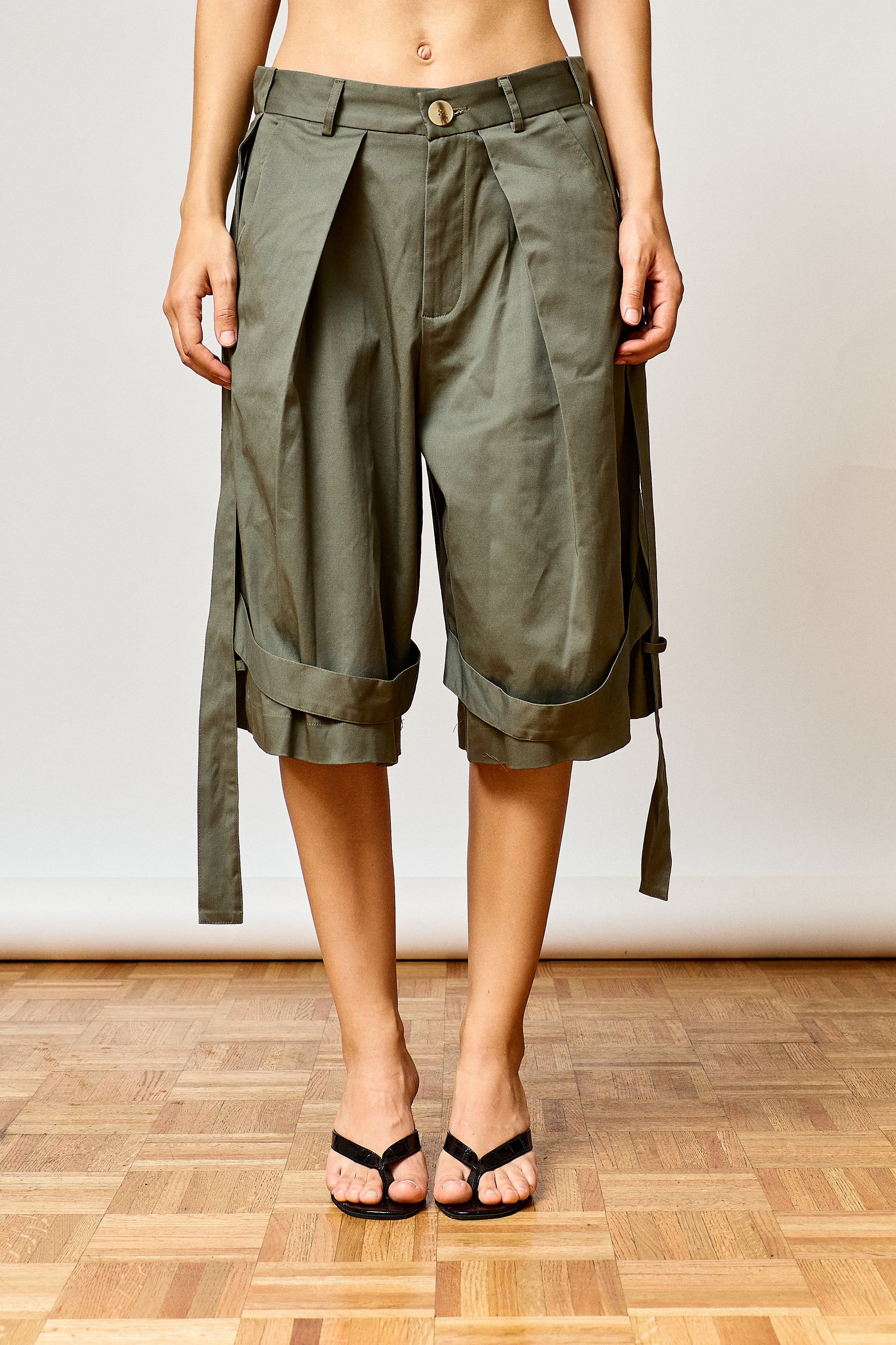 Pliegues delanteros pronunciados y un diseño envolvente con amarras laterales ajustables, que permiten adaptar su forma y volumen.