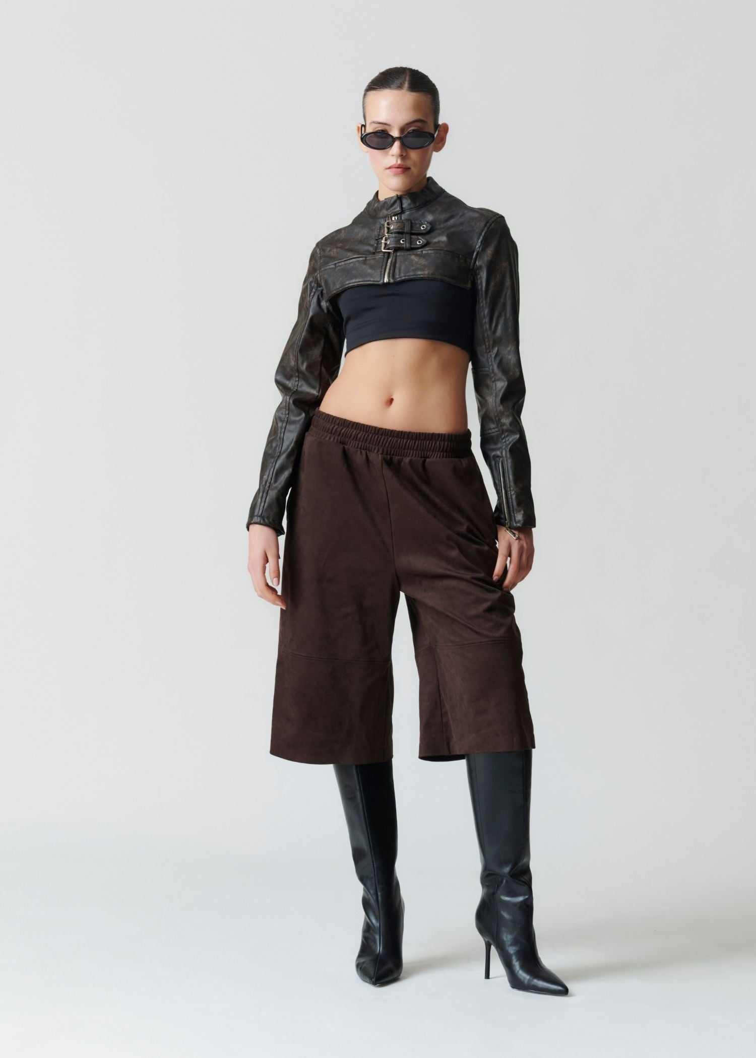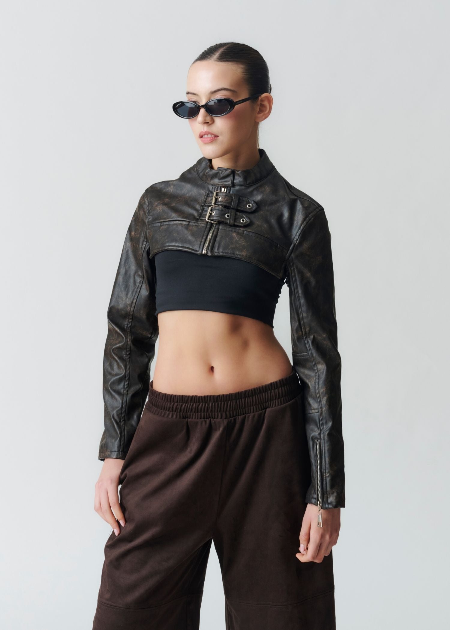 Chaqueta estilo bolero confeccionada en eco.cuero con textura sutil.