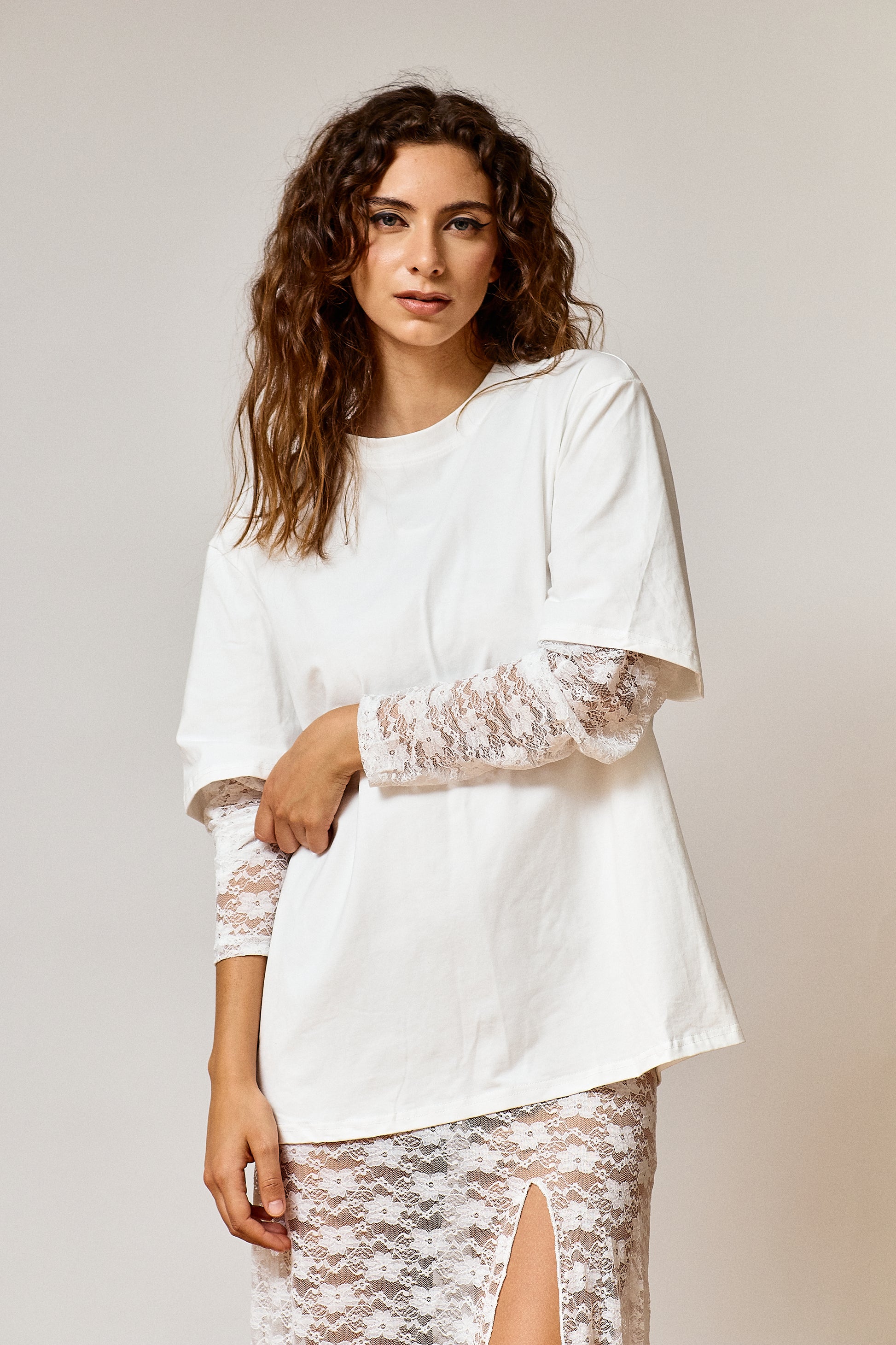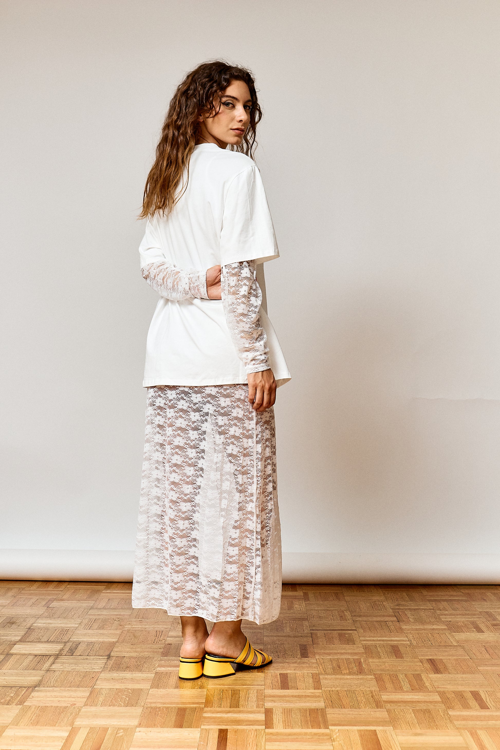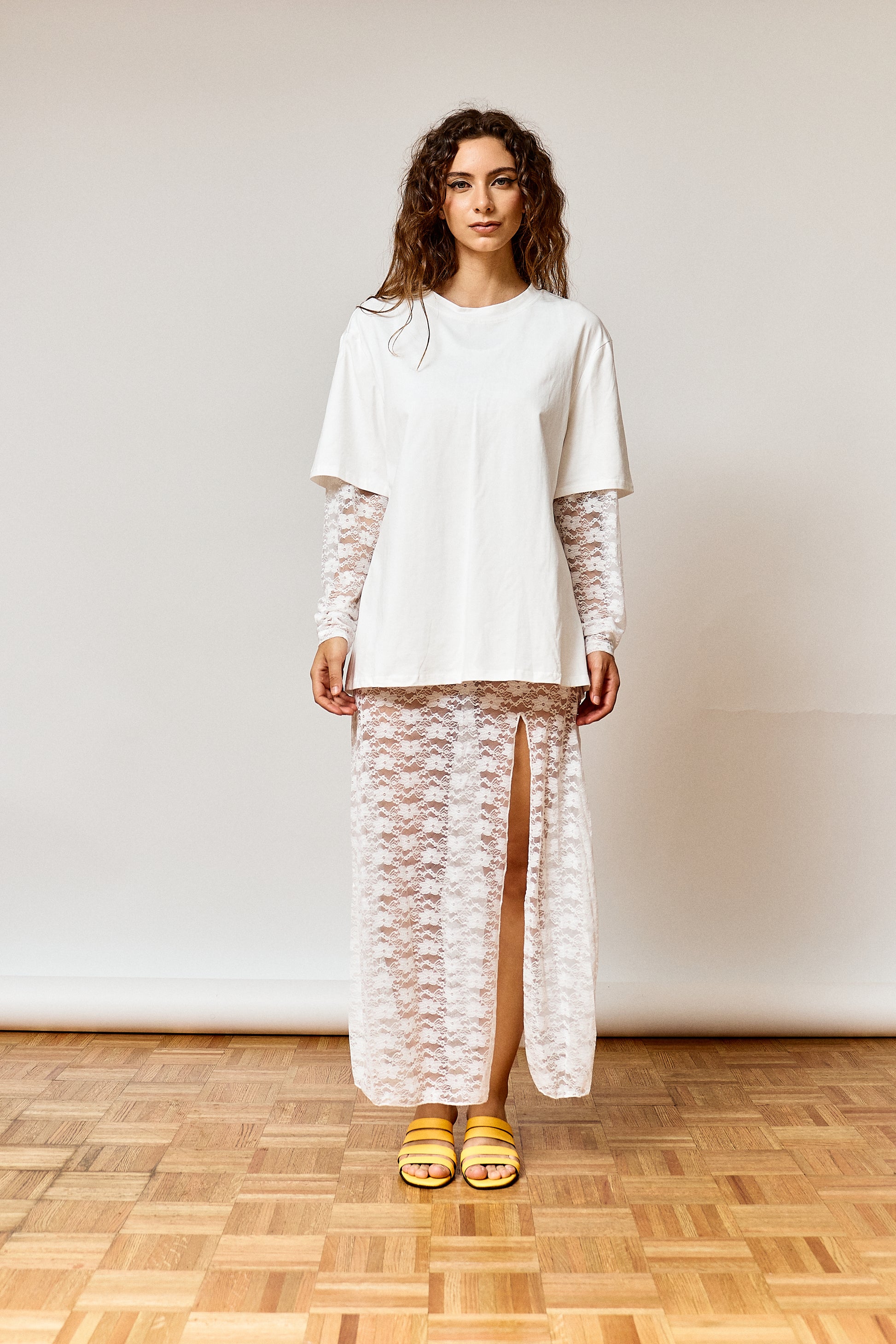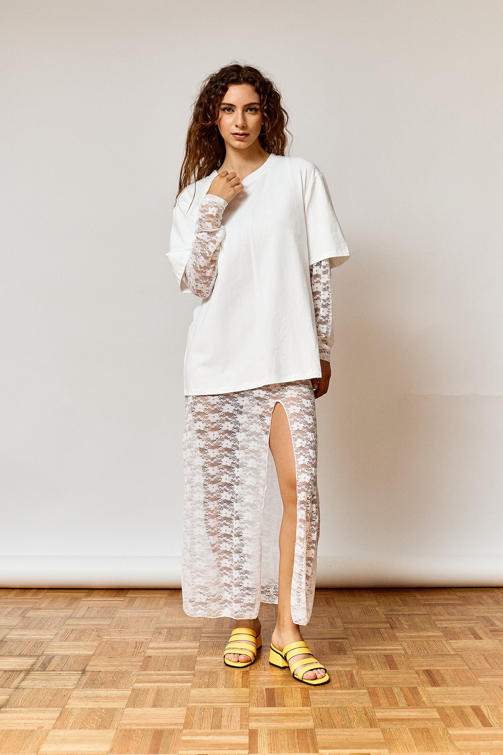 El complemento es un vestido largo de encaje con abertura lateral y caída ligera, ideal para usar encima o por separado.
