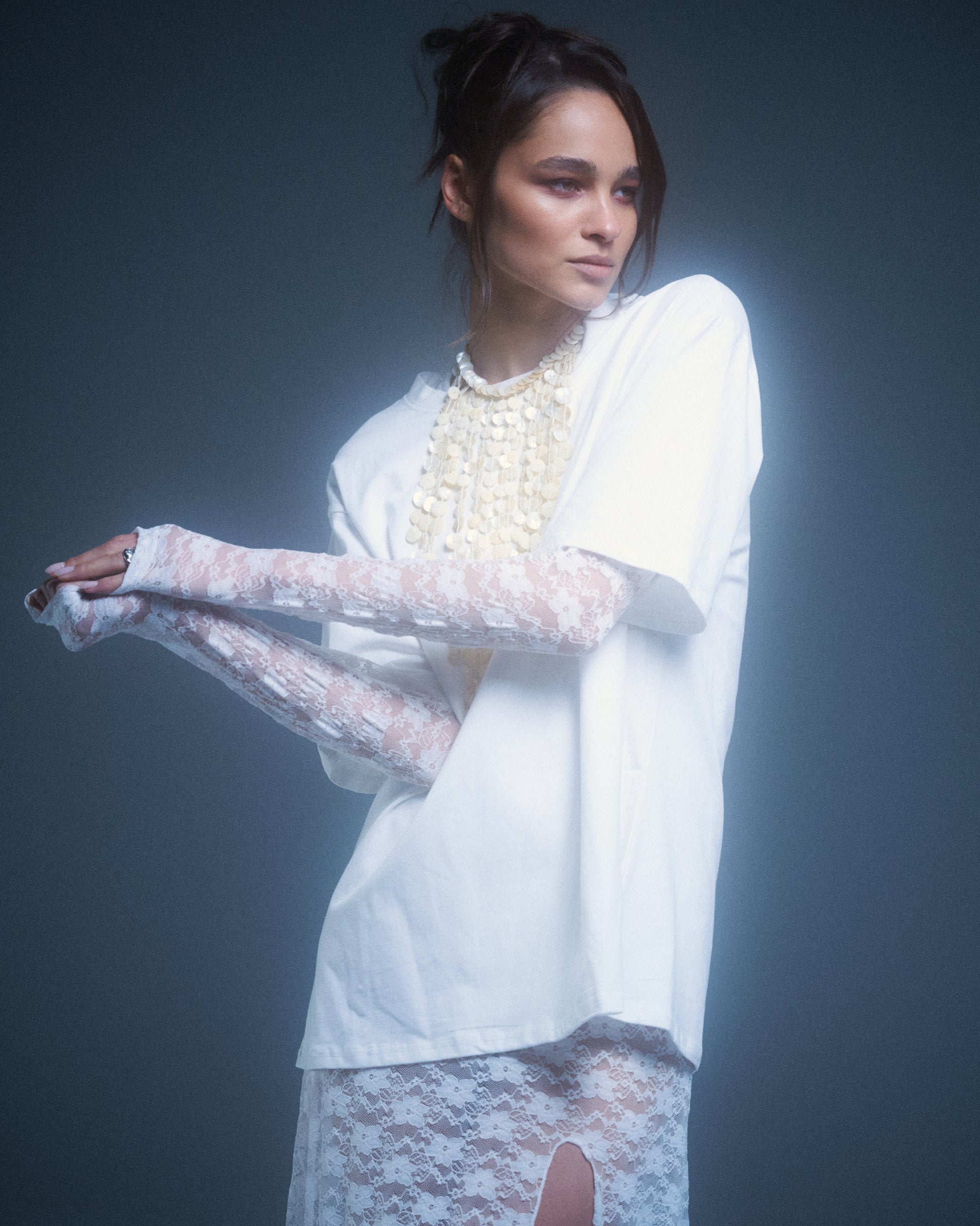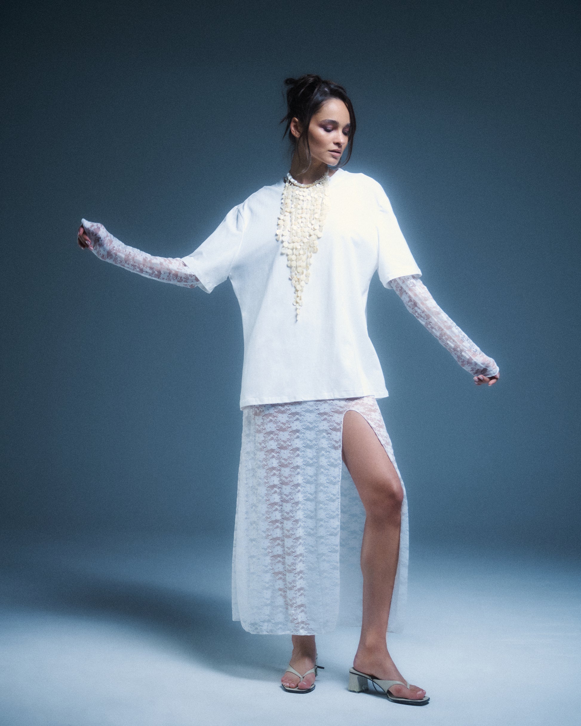 Ambas piezas pueden llevarse juntas para un look etéreo y femenino o independiente para crear múltiples combinaciones.