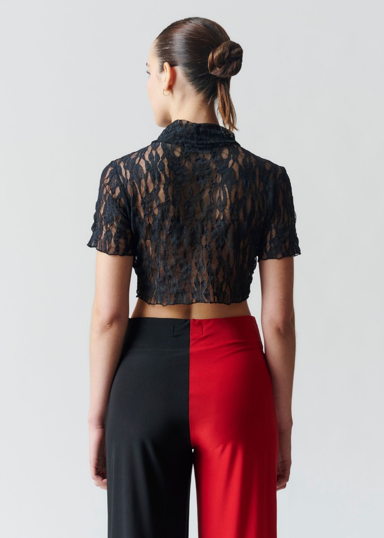 Top corto semitransparente, confeccionada en encaje floras elástico.
