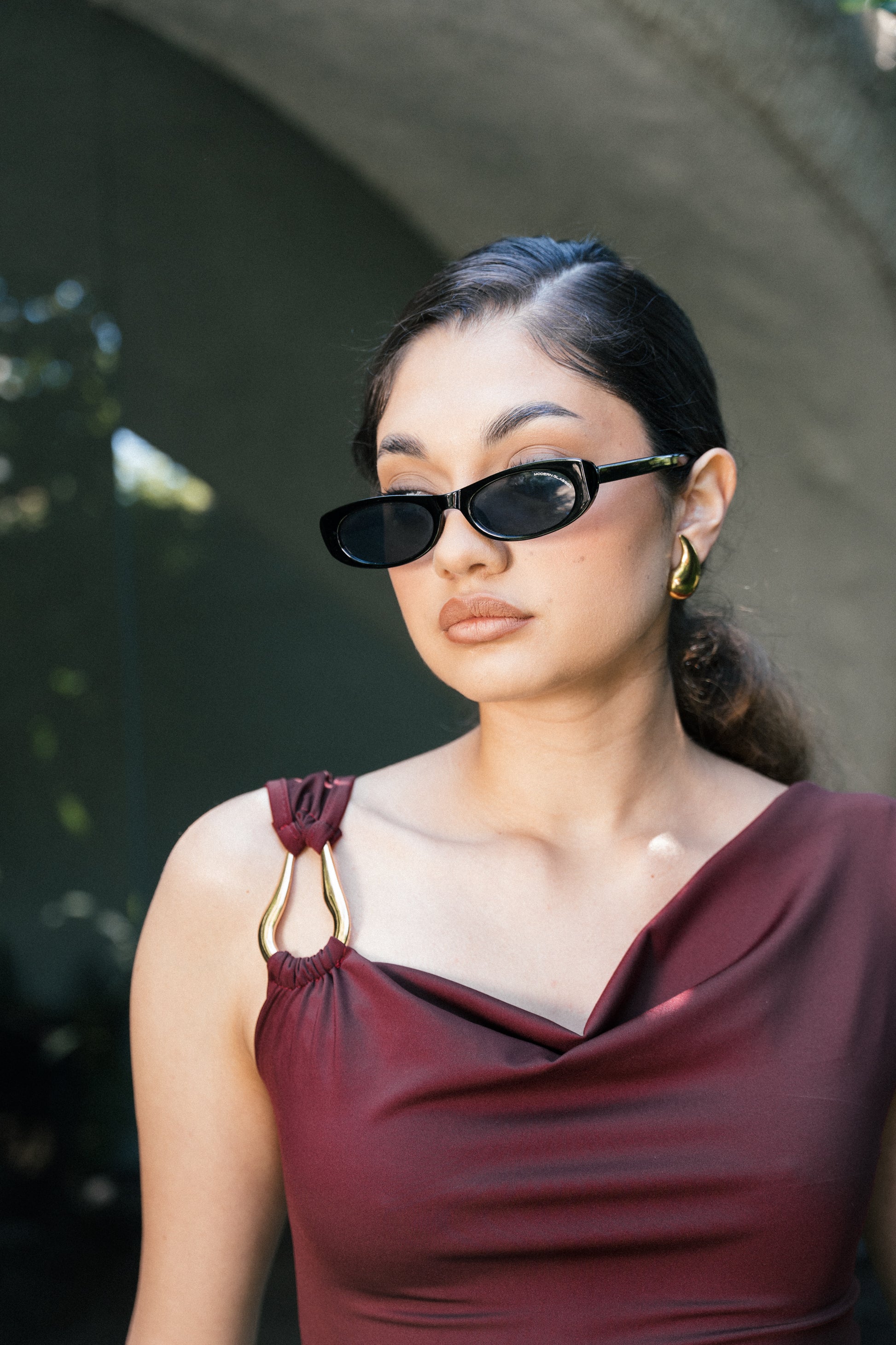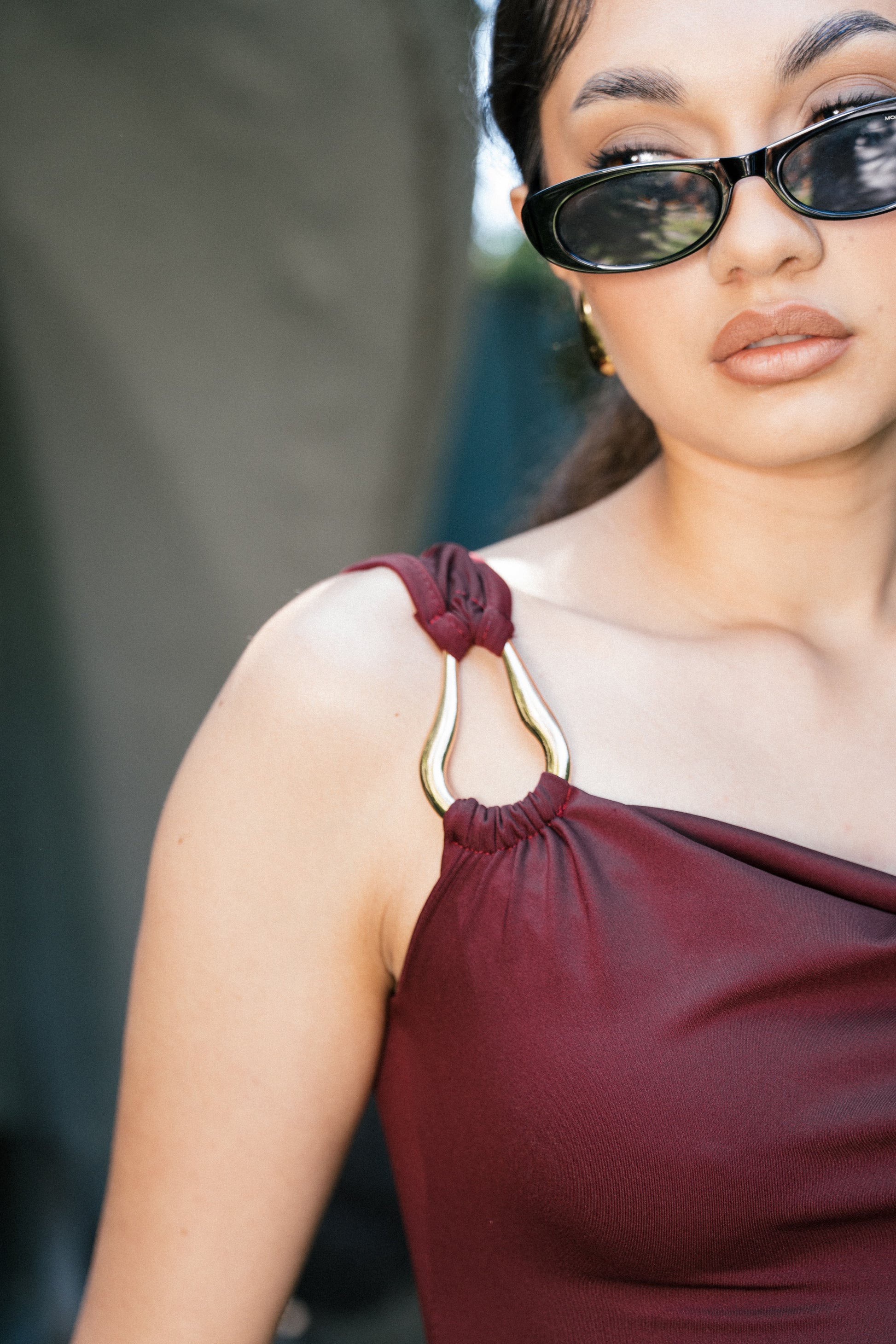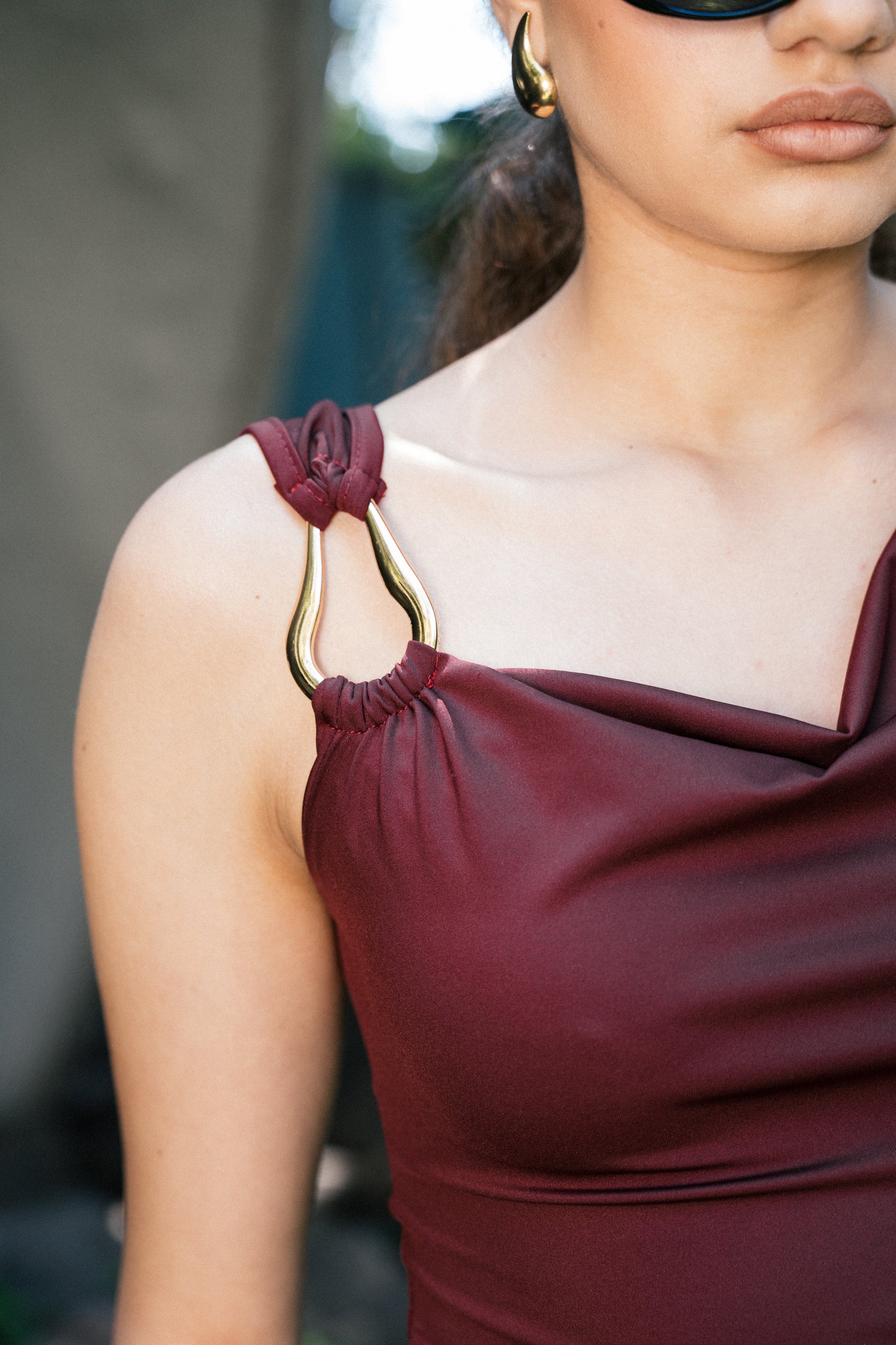 Su diseño destaca por el detalle de argolla lateral que genera un delicado drapeado.