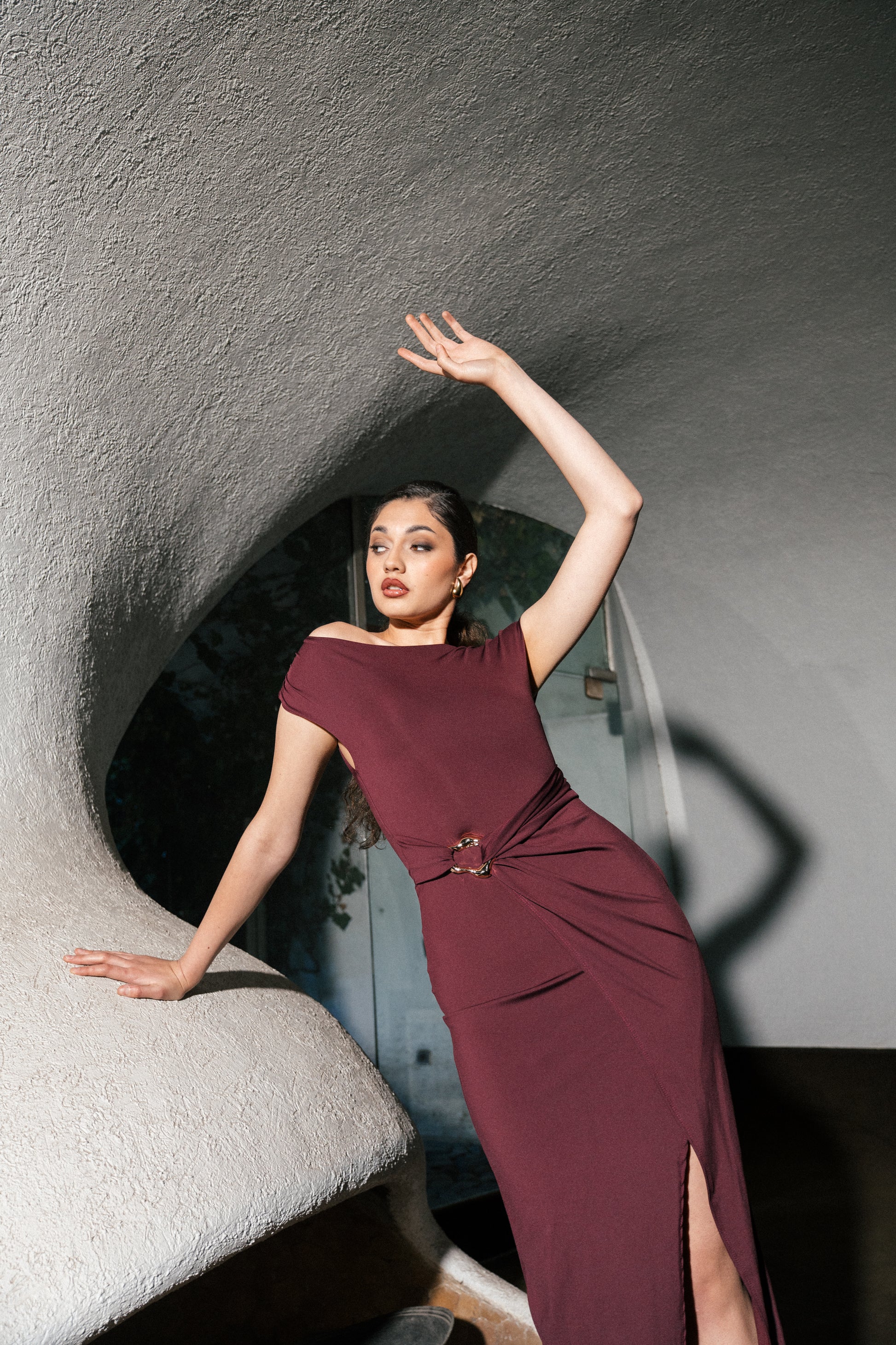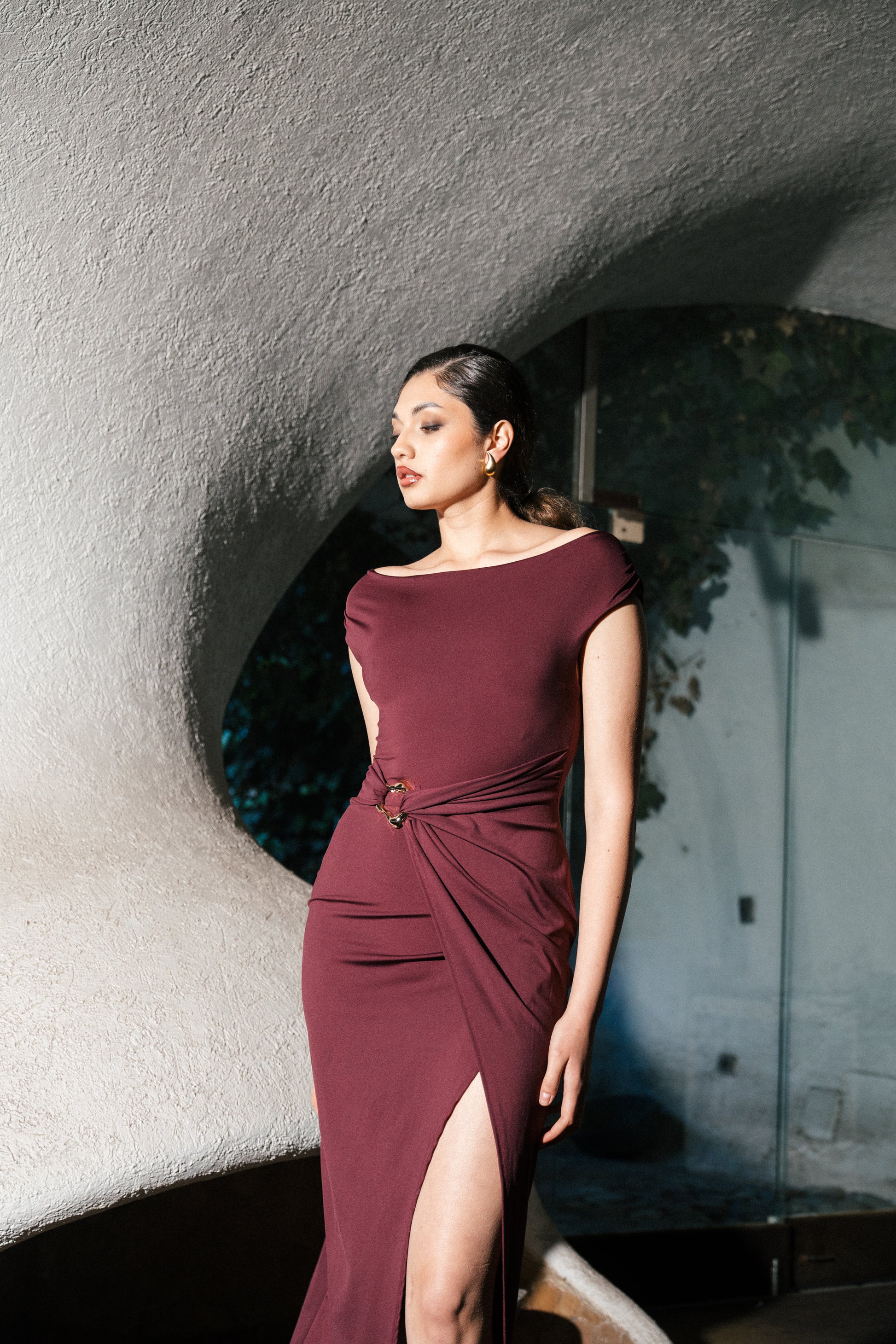 Diseño off shoulder con detalle frontal y drapeado lateral que realza la silueta.