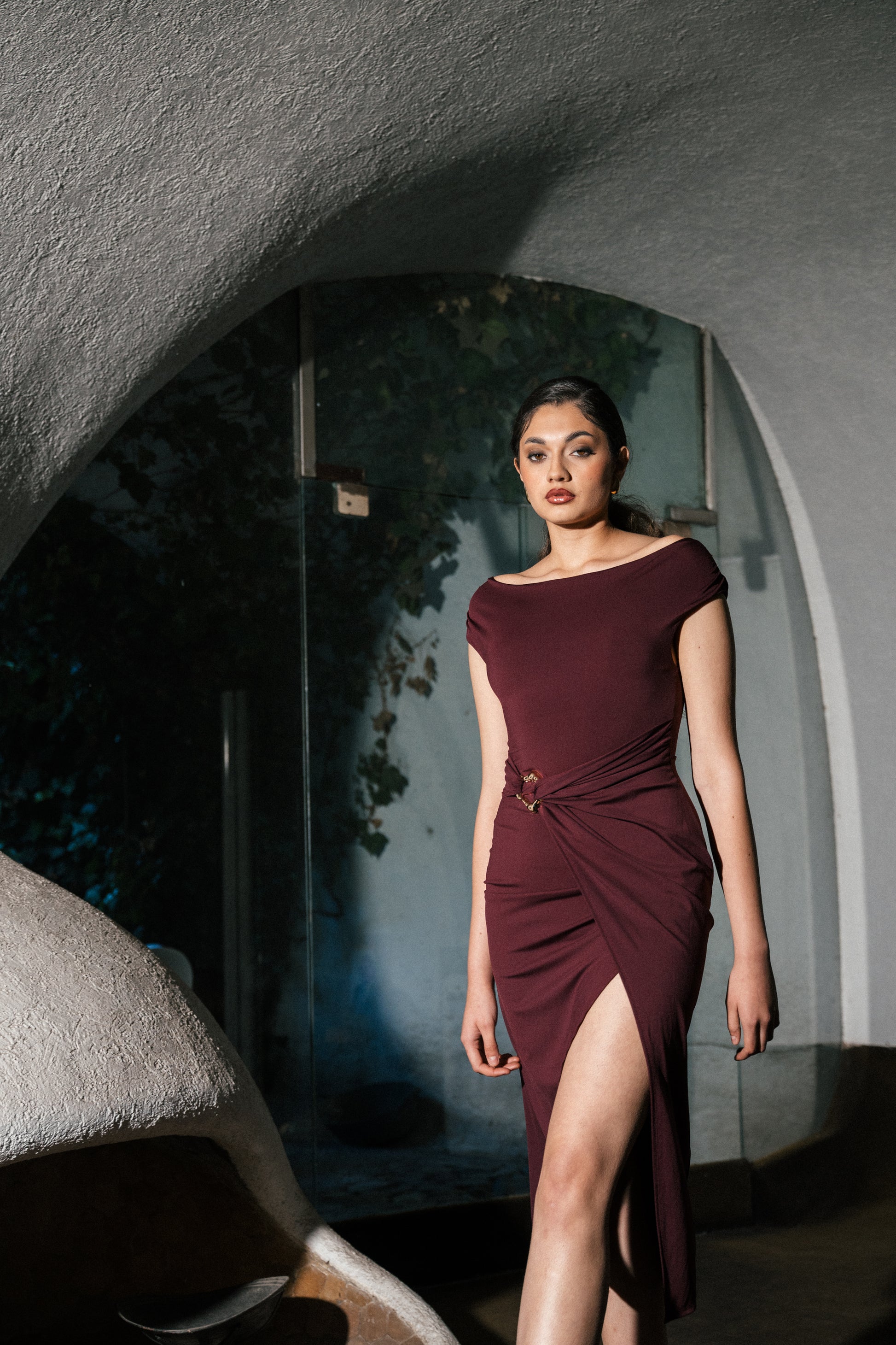 Vestido midi confeccionado en lycra fría de alta calidad.