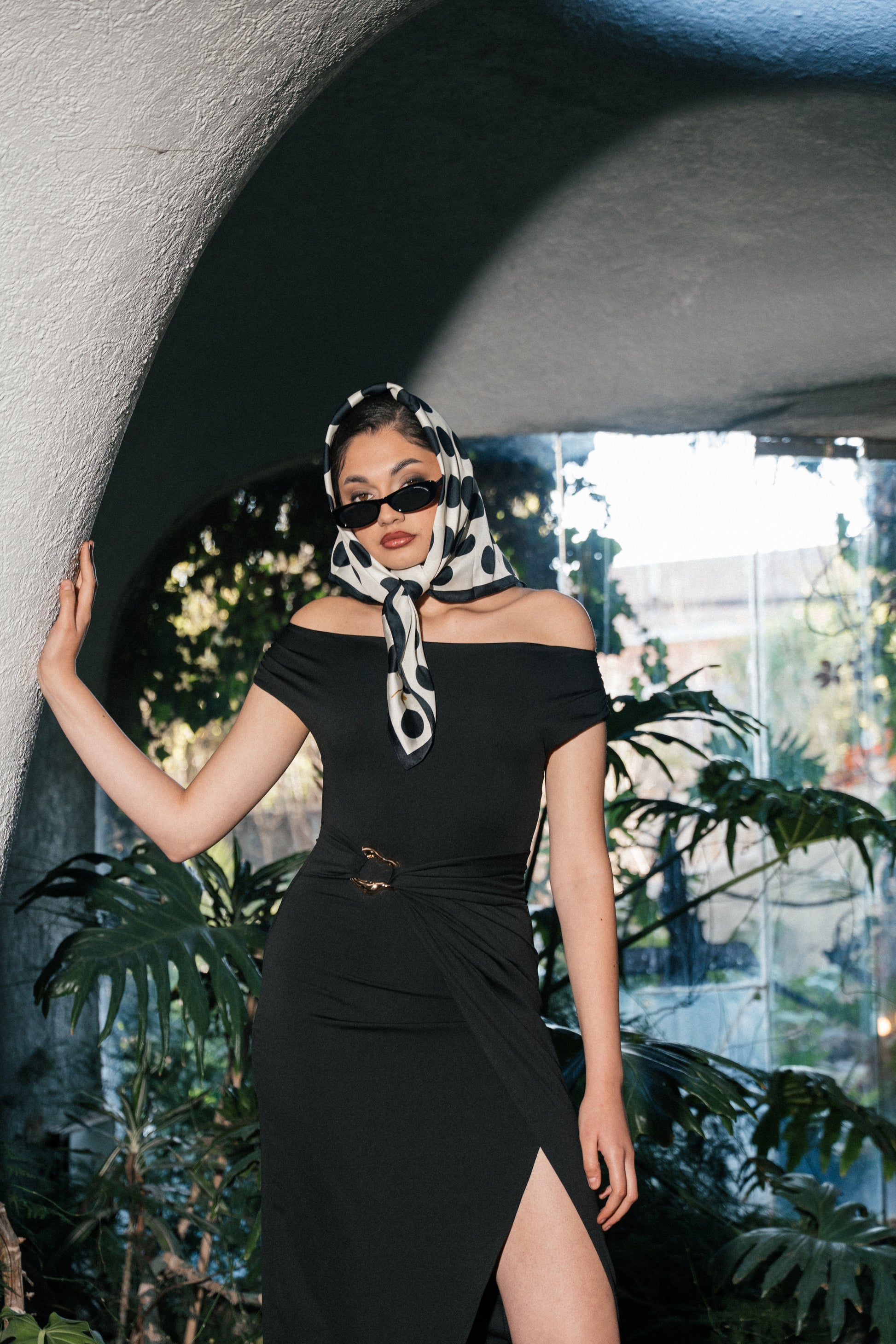 Diseño off shoulder con detalle frontal y drapeado lateral que realza la silueta.