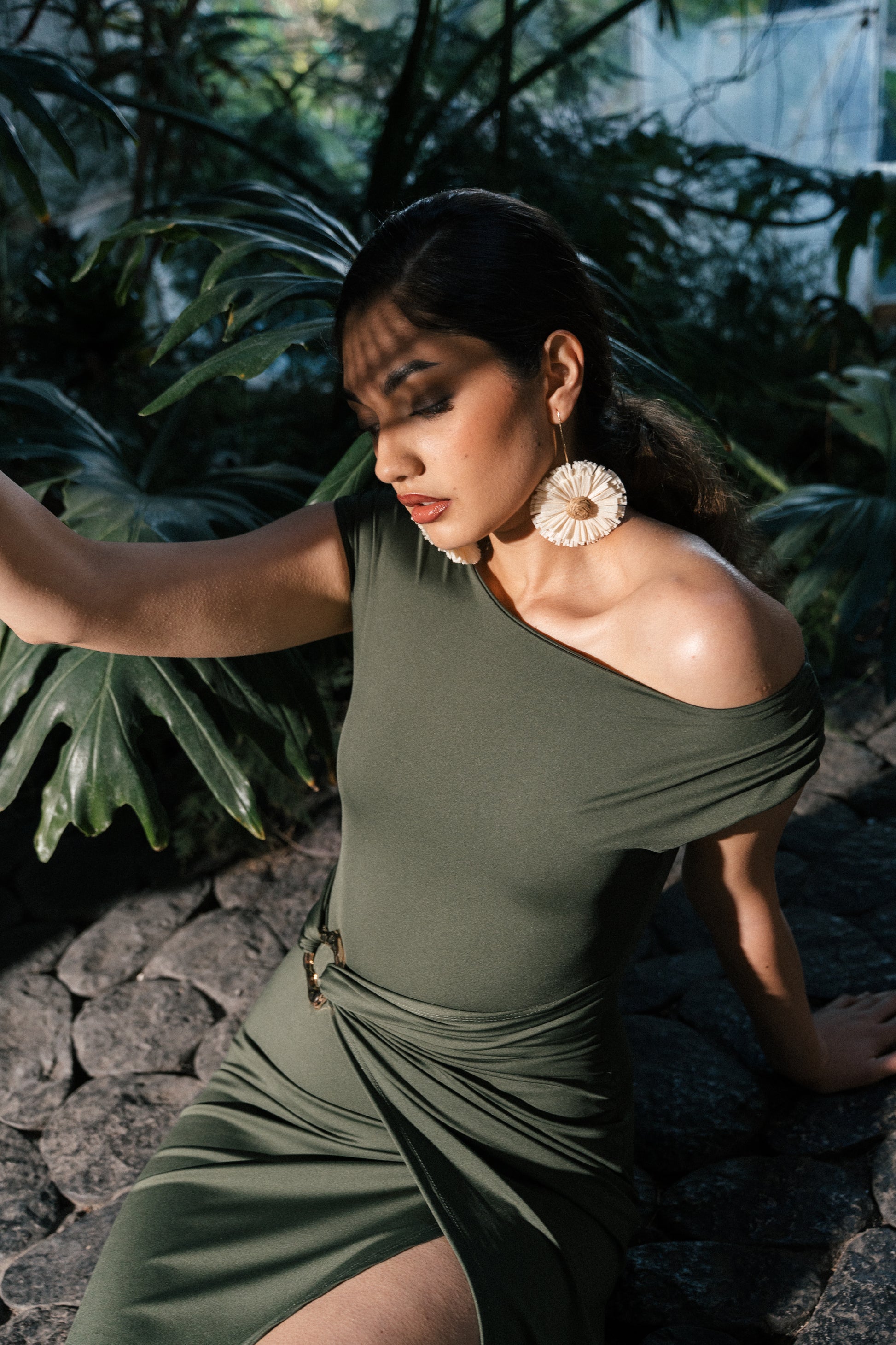 Diseño off shoulder con detalle frontal y drapeado lateral que realza la silueta.